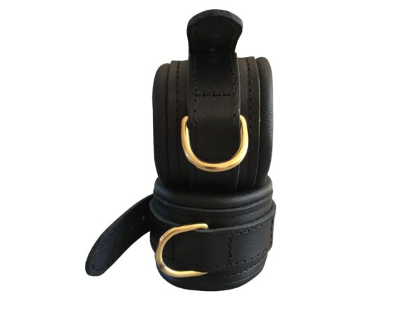 Die Lederfesseln sind mit Ringen aus Messing ausgestattet und der verstellbare Schnallenverschluss auf der Rückseite ist ebenfalls aus Messing.