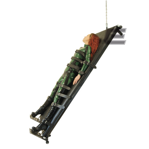 Zwei ansteckbare Laufrollen mit integrierten Fußauflagen steigern den praktischen Nutzen, denn das Bondagebord ist so konstruiert, dass es sich einseitig mittels eines Flaschenzuges oder Motorkranes stufenlos in der Höhe aufrichten lässt.