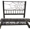 Das Kopfteil ziert ein massives Spinnenetz aus Stahl, welches sich als Blickfang und gern genutzte Fesseleinrichtung versteht.