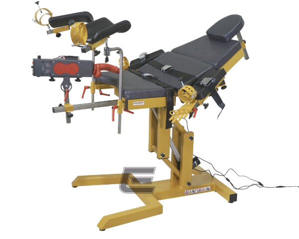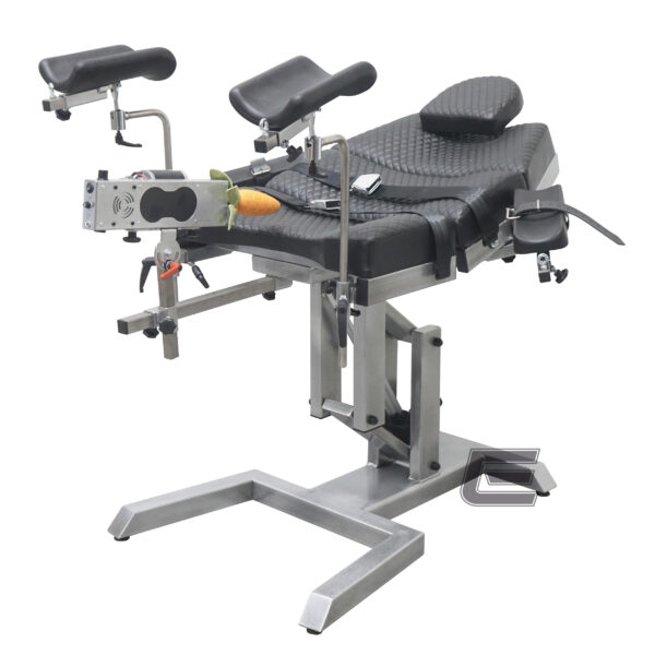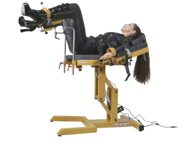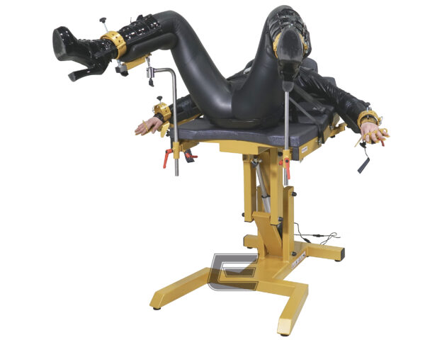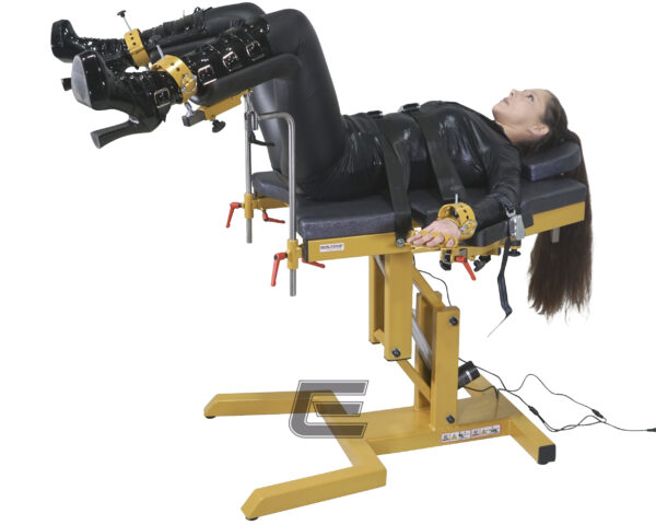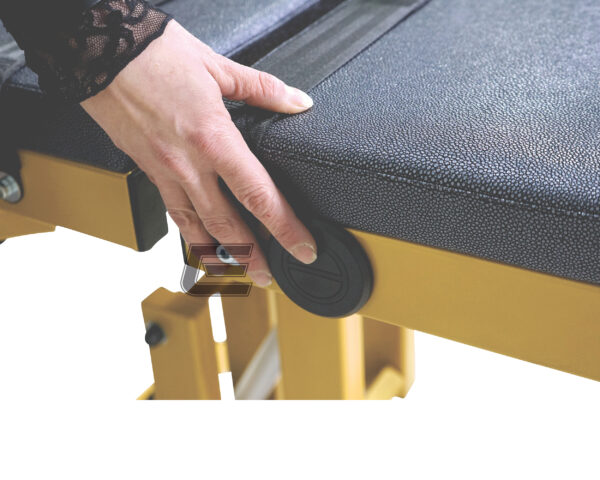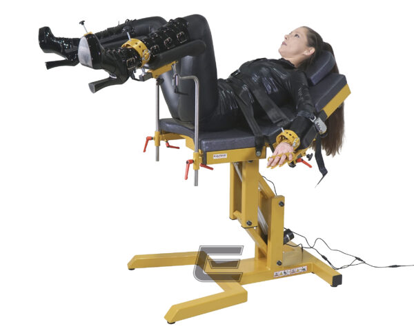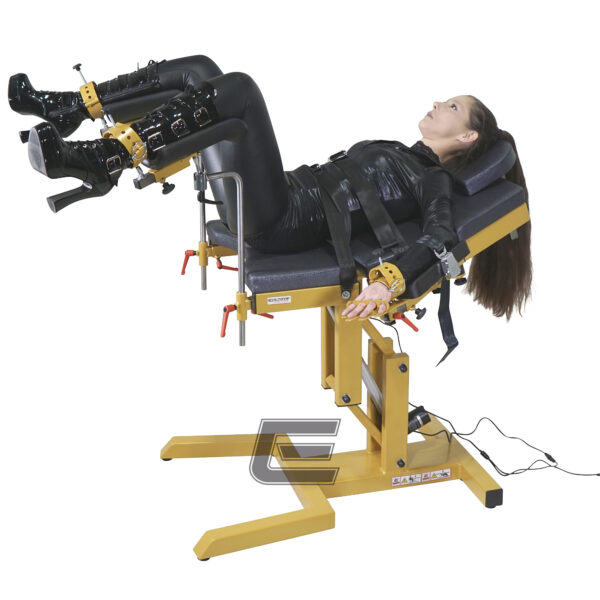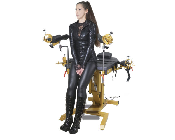 Der Standfuß beherbergt zudem auch die Höhenverstellung. In der Hubmechanik arbeitet ein kräfiger, elektronisch gesteuerter Linearmotor. Auf Knopfdruck wuchtet dieser stufenlos die gesamte Liegefläche sanftmütig mit einer maximalen Hubkraft von 600kg nach oben. Oder eben exakt genau auf die Arbeitshöhe, die man für diverse Behandlungsspiele benötigt. Besonders Damen, welche zum Beispiel gern mit einem Umschnalldildo zu Werke gehen, sind mit diesem BDSM Möbel bestens gewappnet.