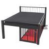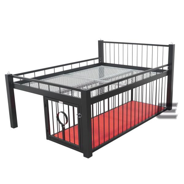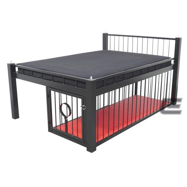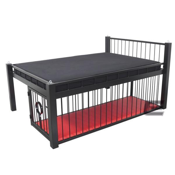 Ein Stahlkäfig befindet sich längsseitig unter dem Bett und kann effektiv auch als dauerfhafte Schlafgelegenheit dienen. Um längere Aufenthalte darin angenehm zu gestalten, z.B. über Nacht, kann auf eine zusätzliche gepolsterte und mit Leder bezogene Bodenplatte zurückgegriffen werden. Ob sich der Käfig links- oder rechtsseitig befinden soll, ist ebenfalls im Optionsmenü auswählbar. Ein auf Wunsch in der Käfigtür angebrachtes kippbares Halseisen behält Sub in hockender Position an Ort und Stelle.