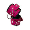 Pink schwarze hochwertige Lederhandfesseln aus robustem Rindsleder. Von innen sind diese Lederfesseln mit weichem Nappaleder gepolstert, die Kanten sind umgenäht und bieten einen hohen Tragekomfort.