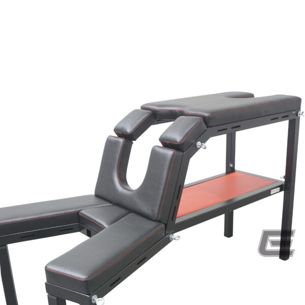 Die rundum am Stahlrahmen der Spanking Bench zusätzlich angebrachten Ösen oder auch Klappösen bieten hervorragende Fixiermöglichkeiten mittels Lederfesseln für Arme und Beine.