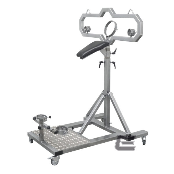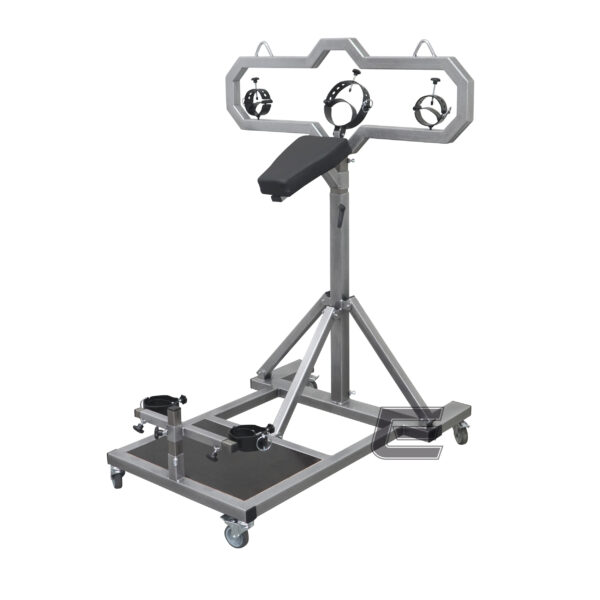 Die Fixiermöglichkeiten für Hände, Hals und Füße bestehen wahlweise aus Ringösen zum Einhängen von Lederfesseln oder beweglich gelangerten Stahlschellen mit Schnellverschluss.