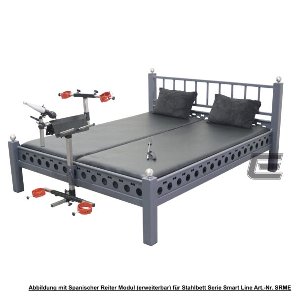 Droht ein Hausbesuch der Schwiegereltern, so lassen sie die Fesselringe allesamt wie auch das Prangermodul komplett abnehmen und schon ist das SM-Möbel entschärft und wahrt als gewöhnliches Bett seinen unschuldigen Anschein.