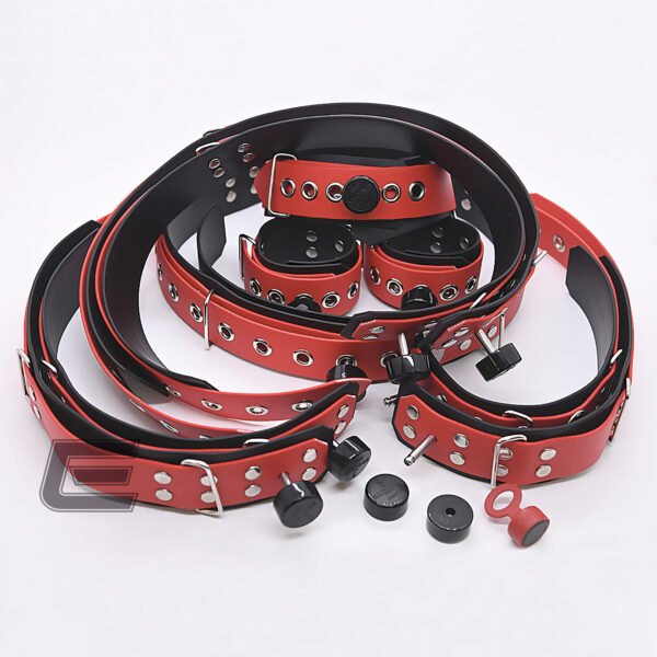 Je Hand-, Fuß- und Oberarmfessel sind zwei, im Halsband und den Oberschenkelfesseln drei, am Taillengurt vier Viereckringe verarbeitet, die für weitere Verbindungen zum Beispiel mit Riemen genutzt werden können.